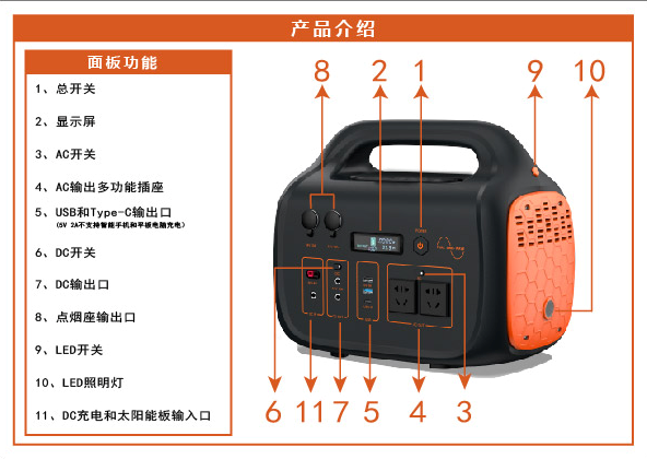 - DC බල සැපයුම ක්රියාත්මක කරන්න: (1) ප්රධාන බල ස්විචයේ අංක 1 බොත්තම ක්ලික් කරන්න (2) DC ස්විචයේ අංක 6 බොත්තම ක්ලික් කරන්න (3) DC බල සැපයුම ආරම්භ කරන්න. සෘජු ධාරාව සිගරට් සැහැල්ලු, DC5525, USB, PD ඇතුළත් වේ