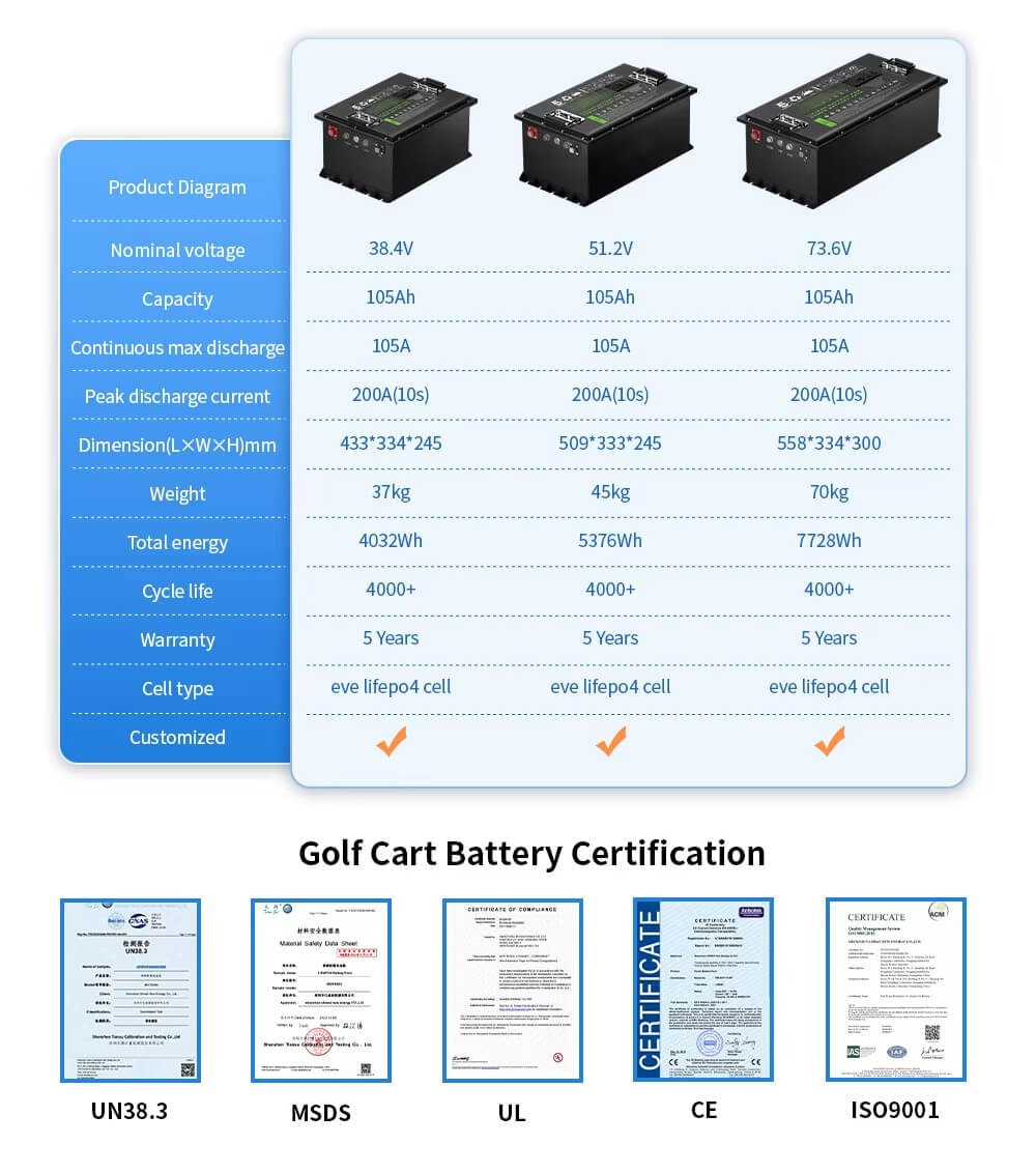 ගොල්ෆ් කරත්ත සඳහා කර්මාන්තශාලා අභිරුචි LiFePO4 ගොල්ෆ් කරත්ත බැටරි 36V 48V 72V 96V 100Ah 200Ah 300Ah ලිතියම් අයන බැටරි ඇසුරුම්