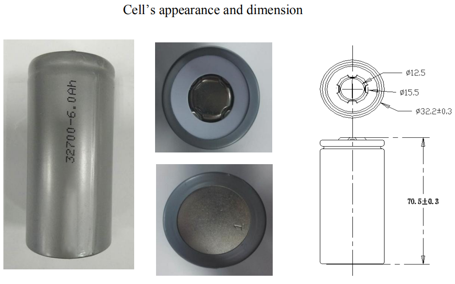 සෛල SIze | විෂ්කම්භය: 32.2 ± 0.3mm, උපරිම 32.5mm | උස: 70.5 ± 0.3mm, Max.70.8mm |
