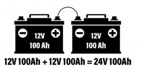 පහත රූපයේ, දෙකක් තිබේ 12V බැටරි මෙම බැටරි බැංකුව 24V පද්ධතියක් බවට පත් කරන ශ්රේණියට සම්බන්ධ වේ. බැංකුවේ මුළු ධාරිතාවය අහ් 100 ක් බව ඔබට දැක ගත හැකිය.